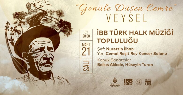 İstanbul Büyükşehir Belediyesi Kültür Dairesi Başkanlığı’na bağlı Orkestralar Müdürlüğü, halk ozanı Âşık Veysel Şatıroğlu’nu “Gönüle Düşen Cemre” konseriyle anıyor. 21 Mart Salı akşamı saat 20.00’de Cemal Reşit Rey (CRR) Konser Salonu’nda gerçekleştirilecek gecede, İBB Türk Halk Müziği Topluluğu’na Belkıs Akkale ve Hüseyin Turan eşlik edecek.