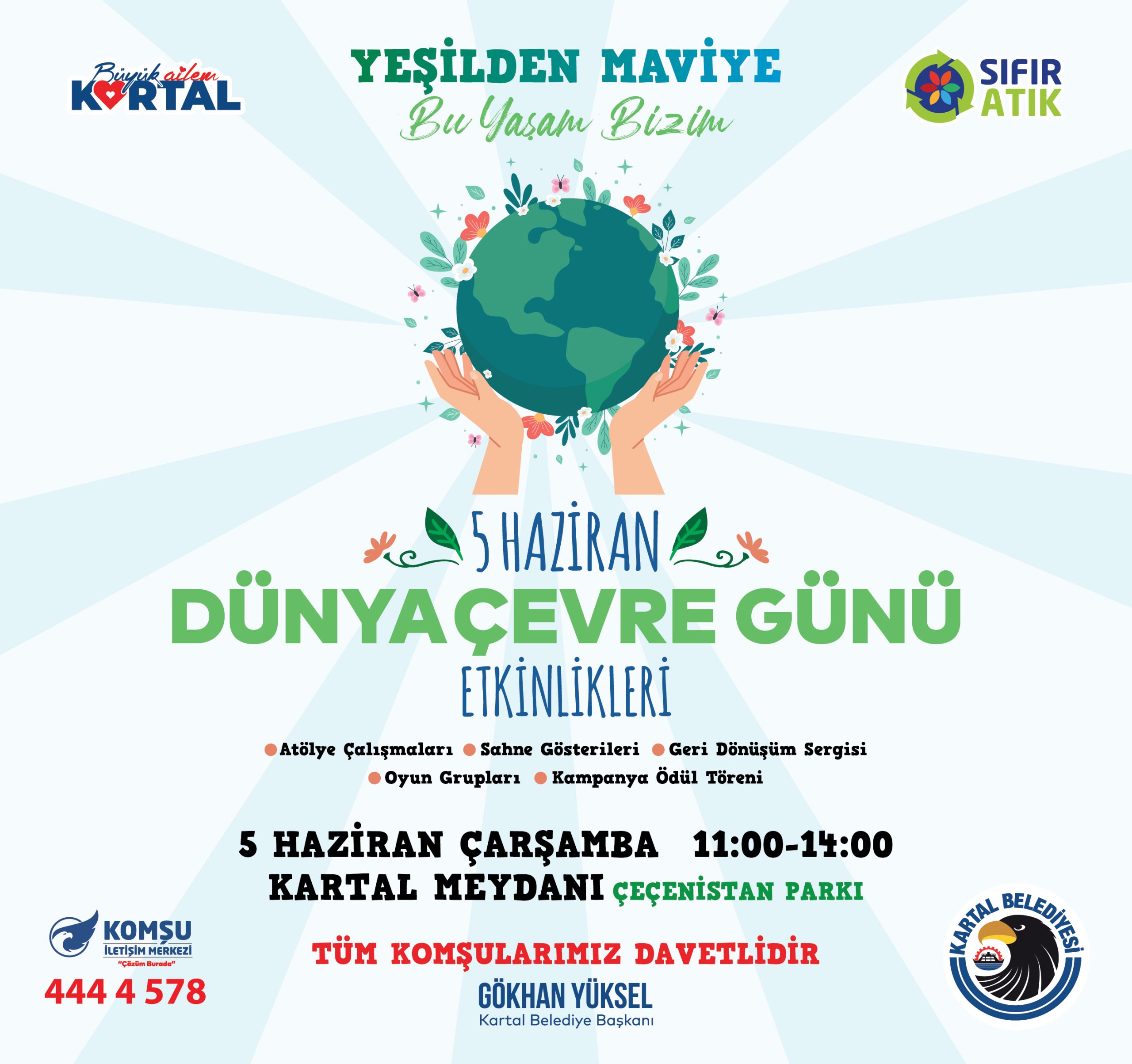 11.00-14.00 saatleri arasında Kartal Meydanı’nda çevre temalı etkinlikler, atölye çalışmaları, dans gösterileri, geri dönüşüm sergisi, oyun ve yarışmalarla Dünya Çevre Günü kutlanacak.