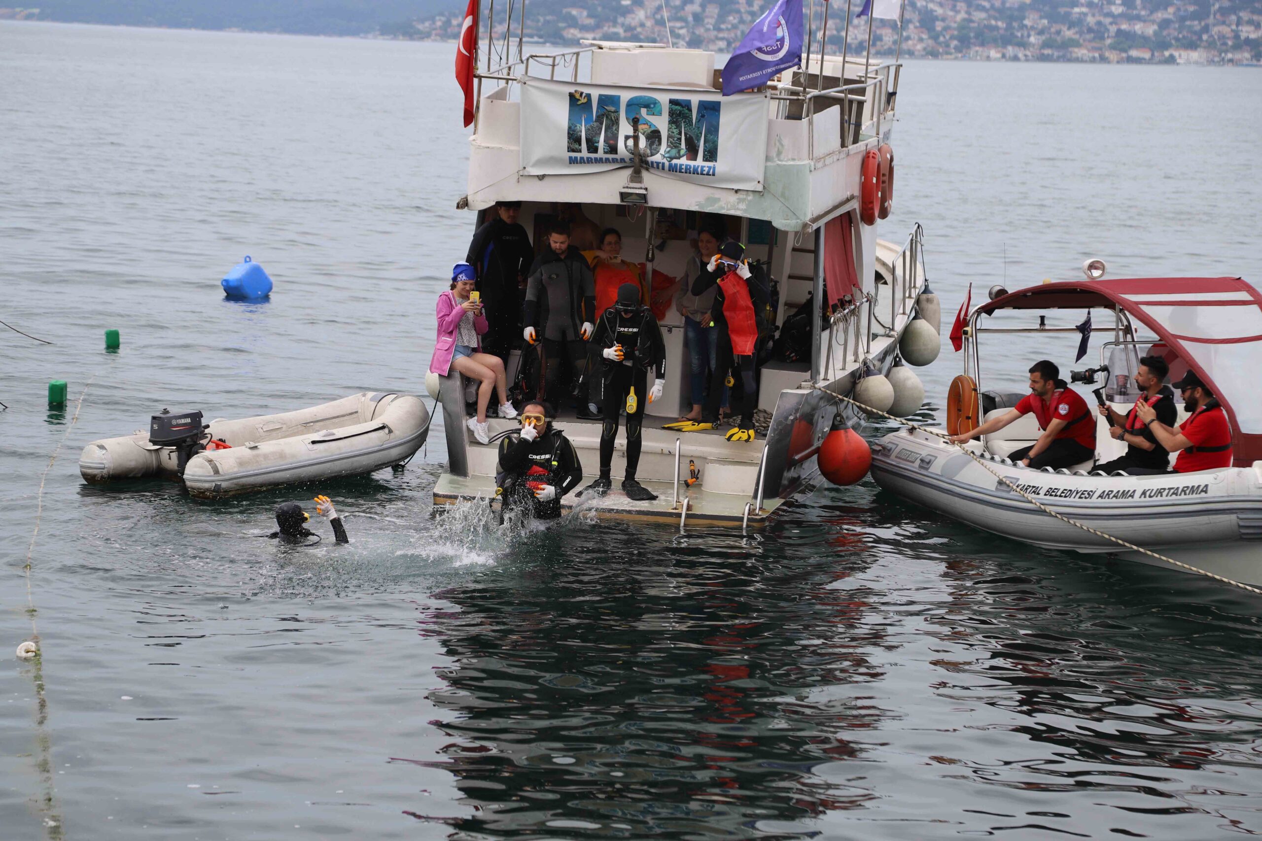 Bu sırada denizdeki teknede hazırlanan Marmara Sualtı Sporları Merkezi’ne bağlı dalgıçlar da dalışlarını gerçekleştirerek deniz tabanından kilolarca katı atığı torbalar ile kıyıya çıkardı.