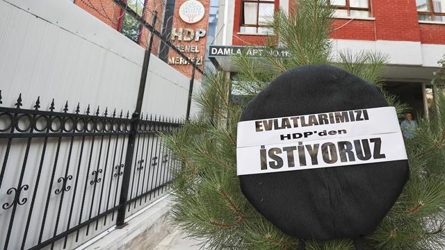 Dağa kaçırılan çocukları için Diyarbakır'da evlat nöbetini sürdüren aileleri temsilen evlat nöbeti tutan babalar, Ankara'da HDP Genel Merkezi binası önüne siyah çelenk bıraktı.
