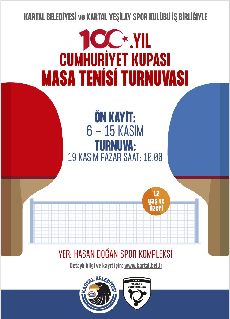 Kartal Belediyesi, Türkiye Cumhuriyeti’nin 100. Yıl kutlamaları kapsamında düzenlenecek olan ‘100. Yıl Cumhuriyet Kupası Masa Tenisi Turnuvası’na ev sahipliği yapacak.