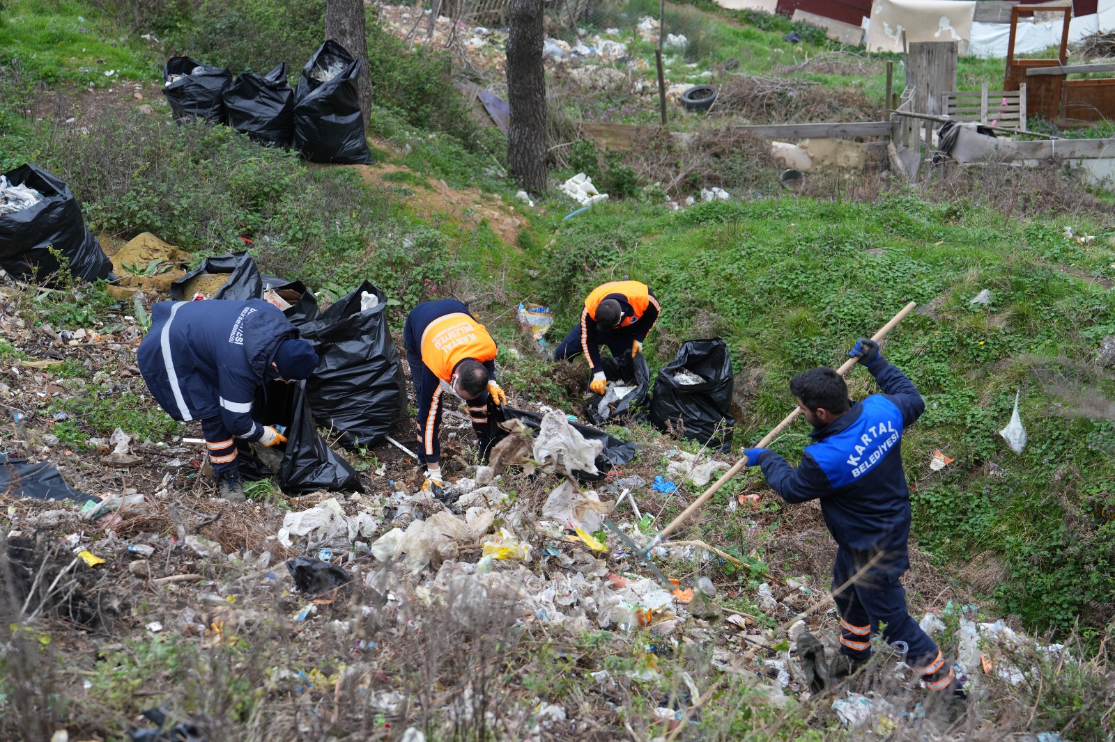 Sık orman örtüsü nedeniyle zaman zaman zor anlar da yaşayan ekipler gün boyunca yüzlerce kilo çöpü torbalayarak çöp kamyonlarına aktardı.