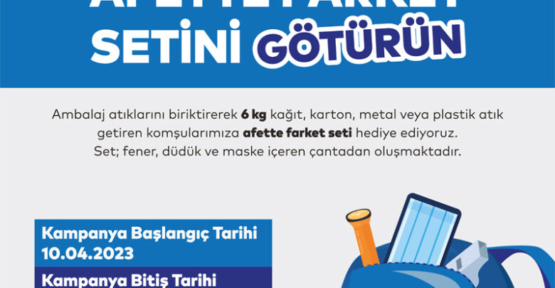 10 Nisan – 10 Mayıs 2023 tarihleri arasında yapılacak olan kampanya kapsamında, 6 kilo ambalaj, metal veya plastik atıklarını biriktirip getiren vatandaşlara bir çanta hediye edilecek. Atıklarını getirenlere fener, düdük ve maskeden oluşan set, bir çanta içinde hediye edilecek. Hediye setleri bireysel katılımlı olarak gerçekleştirilirken sınırlı sayıda olacak.