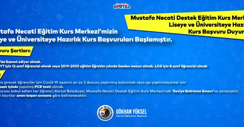 Kartal’da ikamet etme şartının arandığı kurslarda TYT/AYT için 12. sınıf öğrencileri (ya da 2019-2020 yılında liseden mezun olan) ile LGS için 8. sınıf öğrencileri, 05 Kasım-10 Kasım 2021 tarihleri arasında https://bit.ly/MustafaNecatiKursBasvuruOnKayit linki üzerinden online başvuruda bulunabilecek.