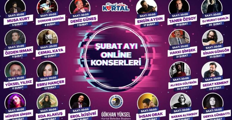 Kültür ve Sosyal İşler Müdürlüğü’nün organizasyonu ile düzenlenecek olan Şubat ayı konserleri; 5 Şubat’ta başlayacak olup 28 Şubat gününe kadar devam edecek. Konserlerin tamamı, Kartal Belediyesi’nin Youtube, Facebook ve Twitter hesaplarından yayınlanacak.