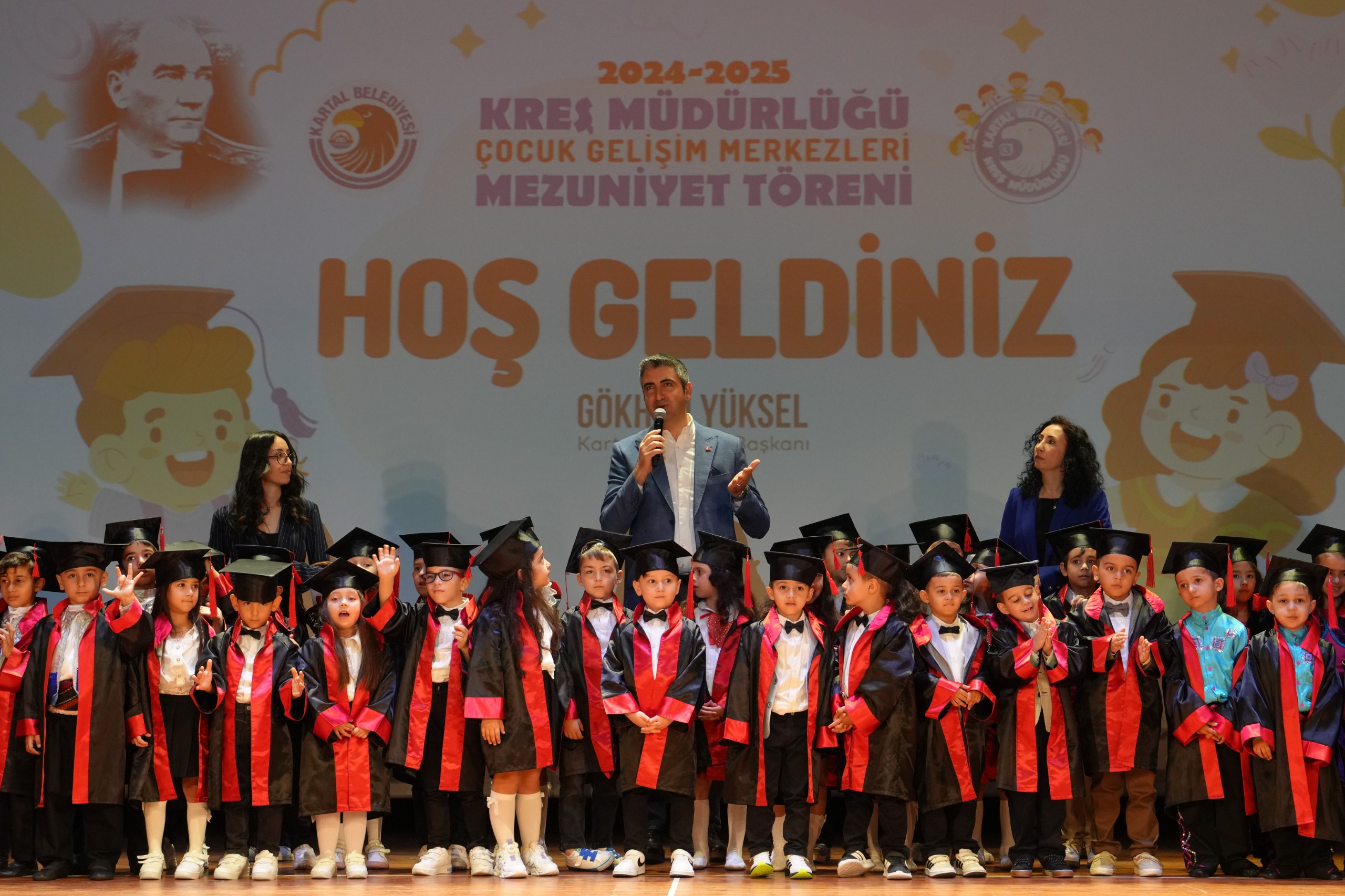 Kartal Belediyesi’ne bağlı kreşlerde eğitim gören minikler, okul öncesi eğitimlerini tamamlayarak mezuniyet sevinci yaşadı. İstanbul Büyükşehir Belediyesi (İBB) Bülent Ecevit Kültür Merkezi’nde düzenlenen tören, duygu dolu anlara ve renkli gösterilere sahne oldu. Kartal Belediye Başkanı Gökhan Yüksel, öğrencileri bu anlamlı günlerinde yalnız bırakmadı. Törende duygu dolu bir konuşma gerçekleştiren Başkan Yüksel, “Bu ülke büyük bir ülke, kimse umudunu kaybetmesin. Güzel işlerin her zaman olacağı bir ülkede yaşıyoruz.” dedi.