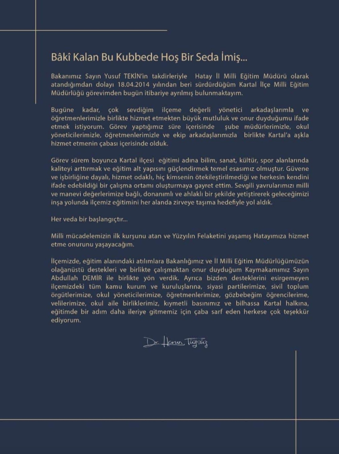 Hatay İl Milli Eğitim Müdürü olan Harun TÜYSÜZ, “Bâki Kalan Hoş Bir Seda imiş…” başlığı altında bir veda mesajı yayımladı.
