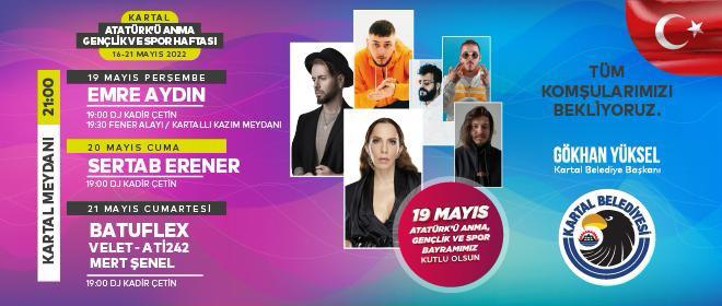 Kartal Belediyesi’nin düzenlediği kutlamalar kapsamında Emre Aydın, Sertab Erener ile rap dünyasının sevilen isimleri Batuflex, Velet, Ati242 ve Mert Şenel şarkılarıyla Kartal Meydanı’nda bir dizi konsere imza atacak. Dj Kadir Çetin’in sahne performanslarının da yer alacağı kutlamalar kapsamında Kartallılar 19 Mayıs heyecanını üç gün üç gece yaşayacak.