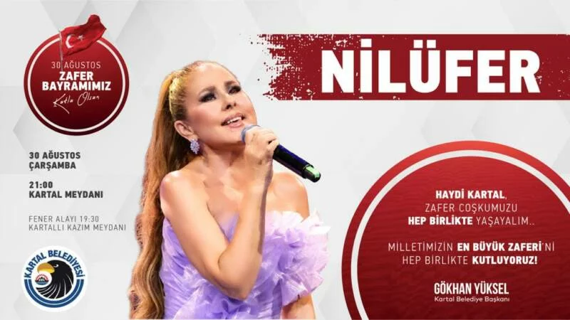 Kartal Belediyesi tarafından düzenlenecek kutlama programı kapsamında 30 Ağustos Çarşamba akşamı saat 19.30’da Kartallı Kazım Meydanı’ndan başlayacak olan fener alayı, Kartal Meydanı’nda yapılacak olan konser ile devam edecek. Kartallıları buluşturan fener alayının ardından sanatçı Nilüfer birbirinden güzel şarkılarıyla sahne alacak. Ünlü sanatçı Nilüfer saat 21.00’da şarkılarını Kartallılarla birlikte seslendirecek.