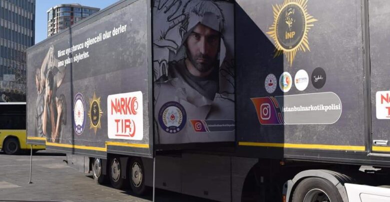 İstanbul Emniyet Müdürlüğü Narkotik Suçlarla Şube Müdürlüğünce dizayn edilen tırda, vatandaşlar bilgilendiriliyor, uyuşturucunun zararları gerçek kullanıcılarının fiziksel değişimi üzerinden anlatılıyor.