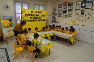 Uluslararası Çocukluk Çağı Kanserleri Günü olan 15 Şubat dolayısıyla düzenlenen programda, çocuklara yönelik farkındalık çalışmaları gerçekleştirildi. Erken evrede teşhis edilen çocukluk kanserlerinin önemine dikkat çekilen etkinlikte, sarı renk teması ön plana çıkarıldı. Çocukluk çağı kanseri farkındalığında sarı rengin umut, iyimserlik ve mutluluğu temsil etmesi nedeniyle etkinlik alanı sarı süslemelerle donatıldı. Minikler de sarı tonlarının ağırlıkta olduğu etkinlik materyalleriyle çalışmalarını gerçekleştirdi. Seramik papatya boyama etkinliği yapan çocuklar hem farkındalık çalışmalarına katıldı, hem de el becerilerine katkı sağladı.