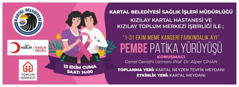 Kartal Belediyesi, Kızılay Kartal Hastanesi ve Kızılay Toplum Merkezi işbirliği ile meme kanserine ilişkin farkındalık oluşturmak ve erken tanıya dikkat çekmek amacıyla 1-31 Ekim Meme Kanseri Bilinçlendirme ve Farkındalık Ayı kapsamında “Pembe Patika Yürüyüşü” düzenlenecek.