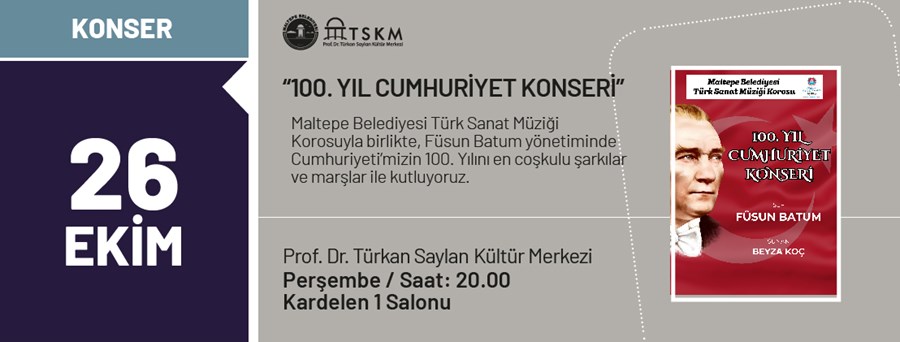 Türkiye Cumhuriyeti’nin 100. kuruluş yıl dönümü bir dizi etkinlikle kutlanacak. Cumhuriyetimizin 100. Yılı etkinlikleri kapsamında; barış, adalet, insan hakları, Cumhuriyet ve Atatürk içerikli; “Cumhuriyet’in 100. Yılında 100 Resim” projesi isimli sergi vatandaşların ziyaretine açılacak. Sergi ay sonuna kadar ziyaret edilebilecek. Cumhuriyet’in 100.yılına özel “Kırmızı 9” isimli karma sergi ve kitap imza günü düzenlenecek. Maltepe Belediyesi Türk Sanat Müziği Korosu, “100.Yıl Cumhuriyet Konseri” yle sahne alacak. Mavi Kumpanya Çocuk Tiyatrosu “Cumhuriyetin Çocukları” isimli oyununu sahneleyecek.