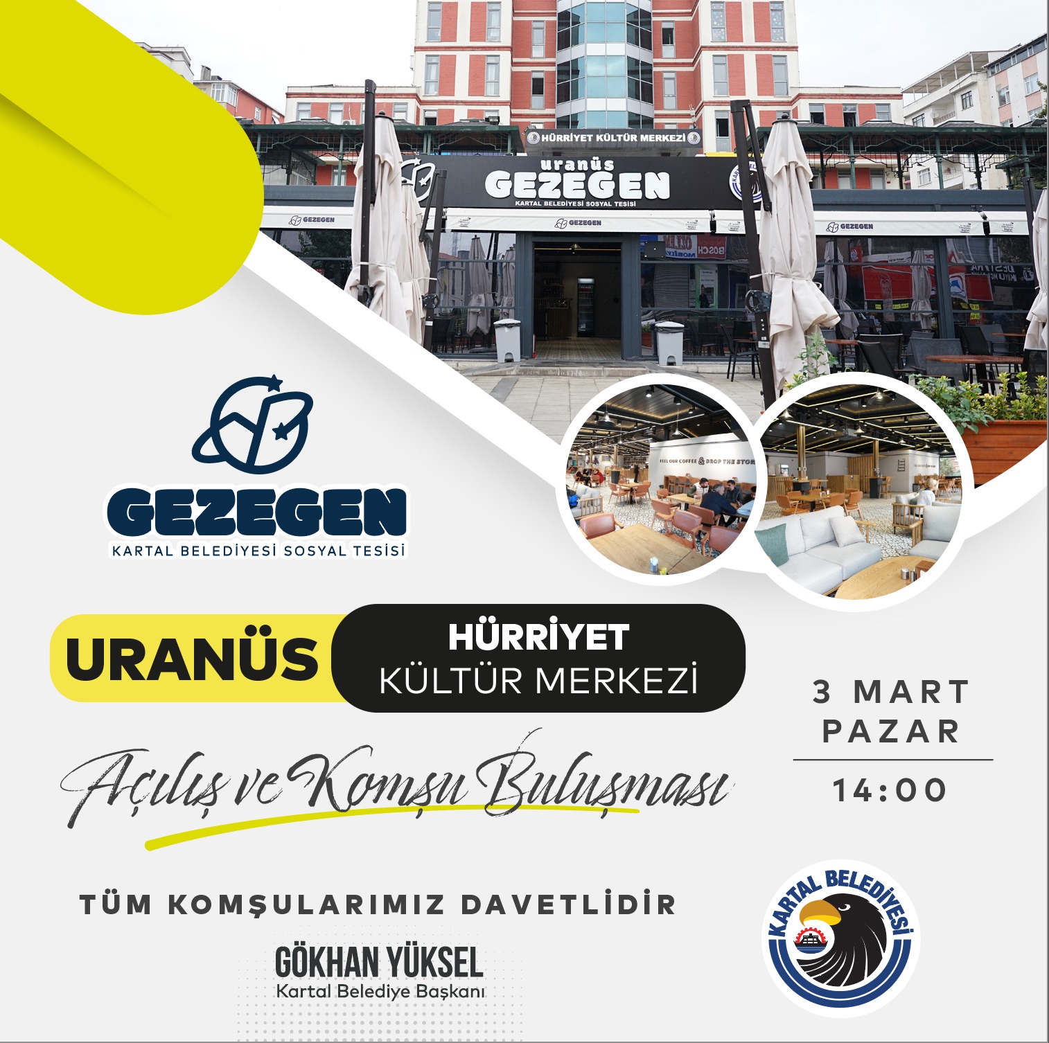 Cumhuriyet’in ikinci yüzyılında özellikle; çocukları, gençleri ve kadınları odağına alarak Kartal’ı geleceğe taşıyacak önemli çalışmalara imza atan Kartal Belediyesi, kısa sürede tamamladığı 11 sosyal tesisten biri olan ve Hürriyet Kültür Merkezi’nde yer alan Uranüs Gezegen Kafe’nin açılışını, düzenlenecek törenle 3 Mart Pazar günü saat 14.00’te komşu buluşmasıyla gerçekleştirecek.