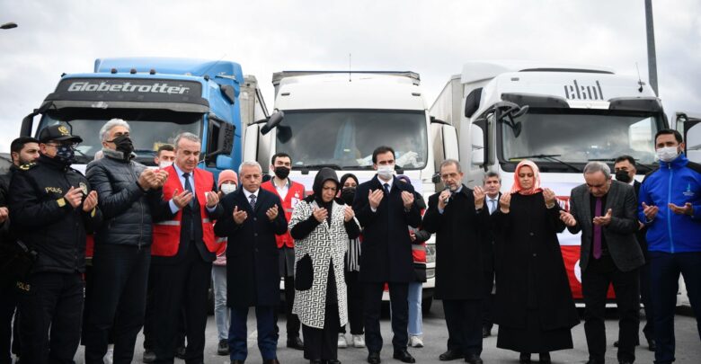 Yapılan protokol konuşmalarının ardından edilen dua ile 3 tır insani yardım malzemesi dolu tır yola çıktı.