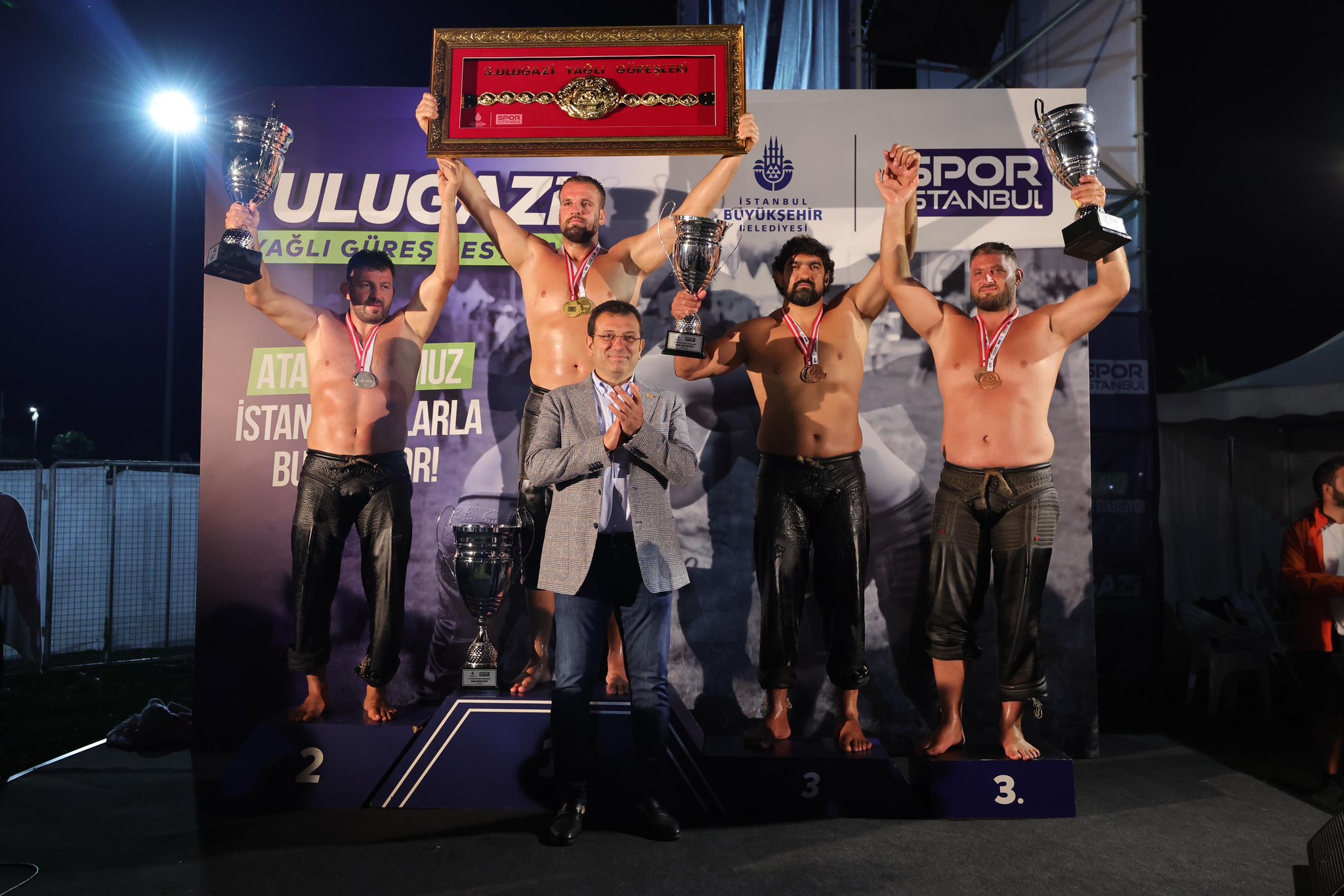 Final müsabakasının ardından Başpehlivan Hüseyin Gümüşalan altın kemer ve kupasını, finalist Abdullah Güngör ile güreşlerin üçüncüleri İsmail Koç ve Nedim Gürel madalya ve kupalarını İBB Başkanı Ekrem İmamoğlu’nun elinden aldı.